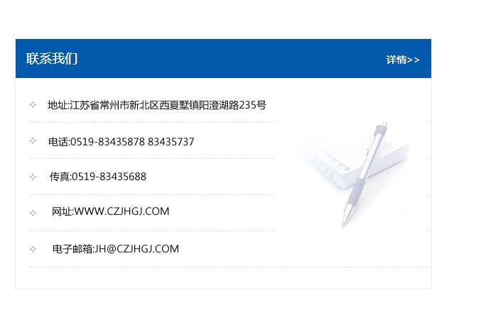 地址:常州市新北區(qū)友邦商務(wù)大廈1幢16、17層  電話:0519-85101652  傳真:0519-85112595  郵編:213022  網(wǎng)址:www.cz-jiayue_cn.sxsunone.com  郵箱:xiajifengaa@163.com